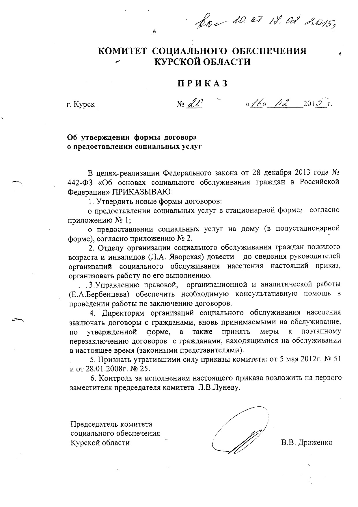 Приказ Комитета социального обеспечения Курской области №20 от 16.02.2015г. Об утверждении формы договора о предоставлении социальных услуг