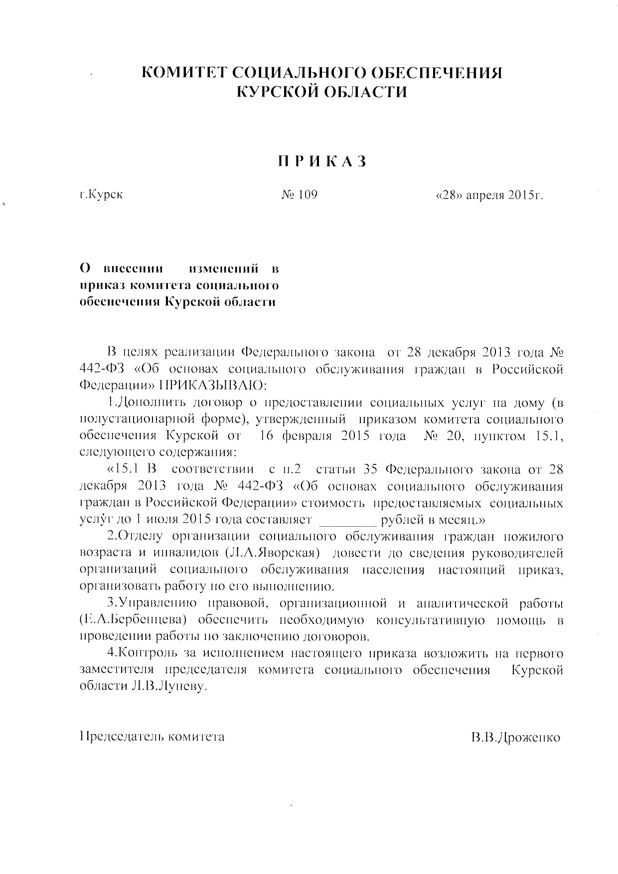 Приказ Комитета социального обеспечения Курской области №109 от 28.04.2015г. о внесении изменений в приказ комитета социального обеспечения Курской области