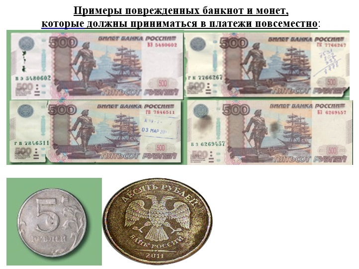Денежные знаки с такими повреждениями должны приниматься всеми банками, предприятиями торговли и сферы услуг, организациями и учреждениями независимо от формы собственности и сферы деятельности.