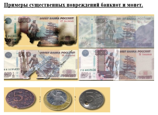 Перечень повреждений и правила обмена поврежденных банкнот и монет Банка России определен Указанием Банка России от 26 декабря 2006 года  № 1778-У «О признаках платежеспособности и правилах обмена банкнот и монеты Банка России».