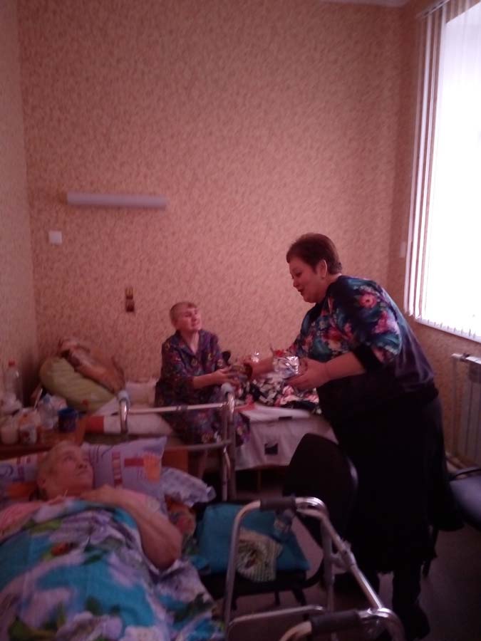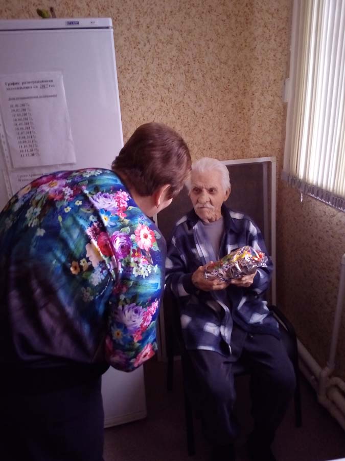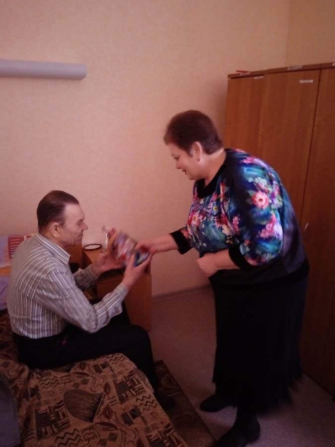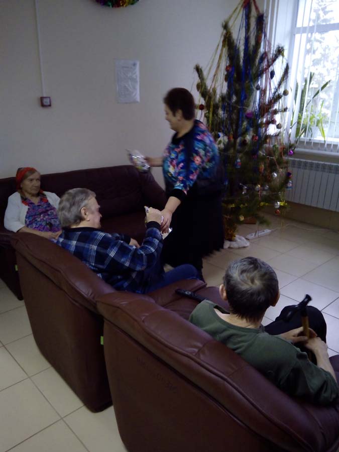 Каждый житель отделения получил новогодний подарок от депутата Д.В.Гурина, которые вручила старикам помощник депутата Г.А.Коршикова.