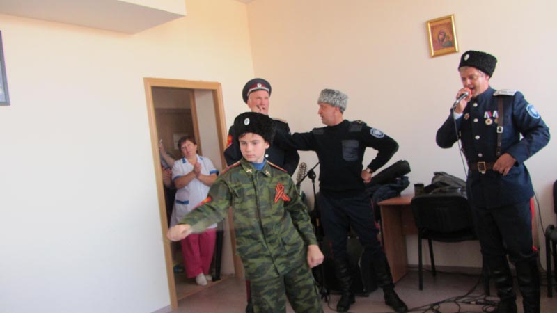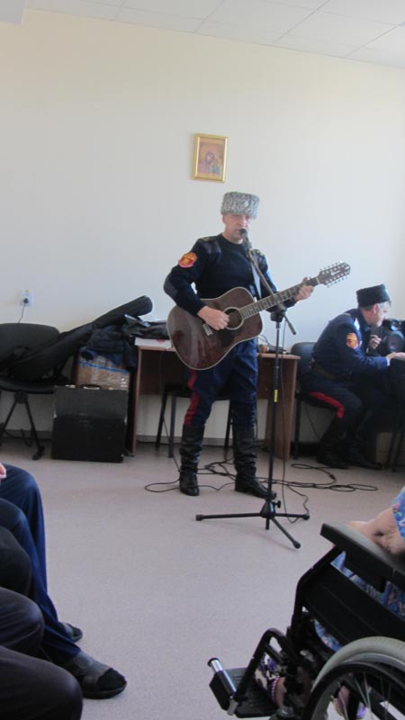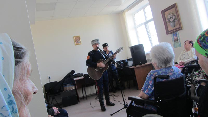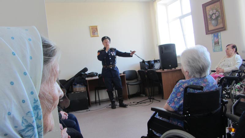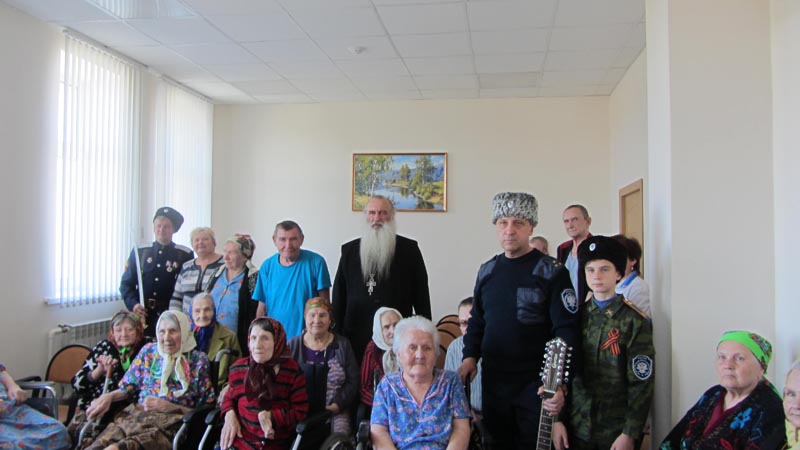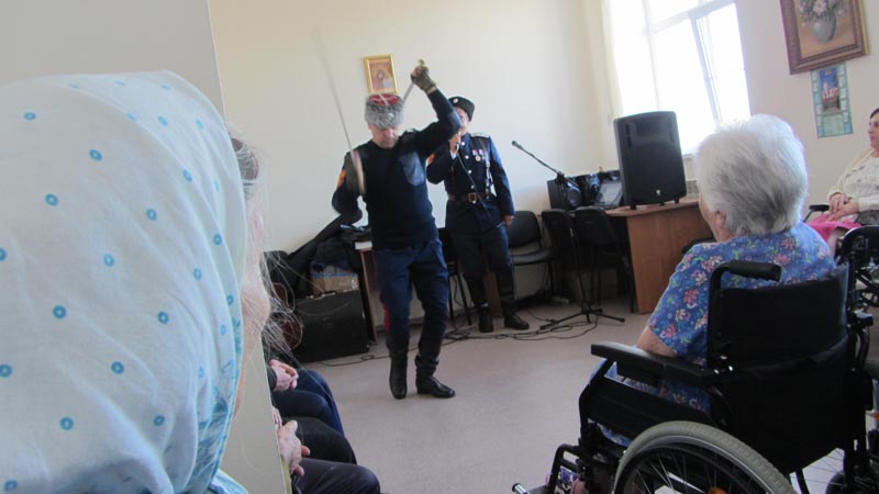19 октября 2019 года настоятель храма Архангела Михаила протоирей отец Василий, совместно с представителями Сообщества казаков п.Солнцево, посетили Дом-интернат. Посещение отделения священником совершается постоянно, и пожилые люди с радостью ждут его слов утешения, ободрения и наставления в духовном делании. Казаки же прибыли впервые, удивив проживающих своим казачьим обмундированием. Они провели  праздничный концерт, в духе казачества , показали владение оружием  Тех, кто не может самостоятельно передвигаться, священник с казаками посетили лично в их комнатах, где вручили им сладости. В конце батюшка пожелал всем крепкого здравия и помощи Божией в духовной жизни.